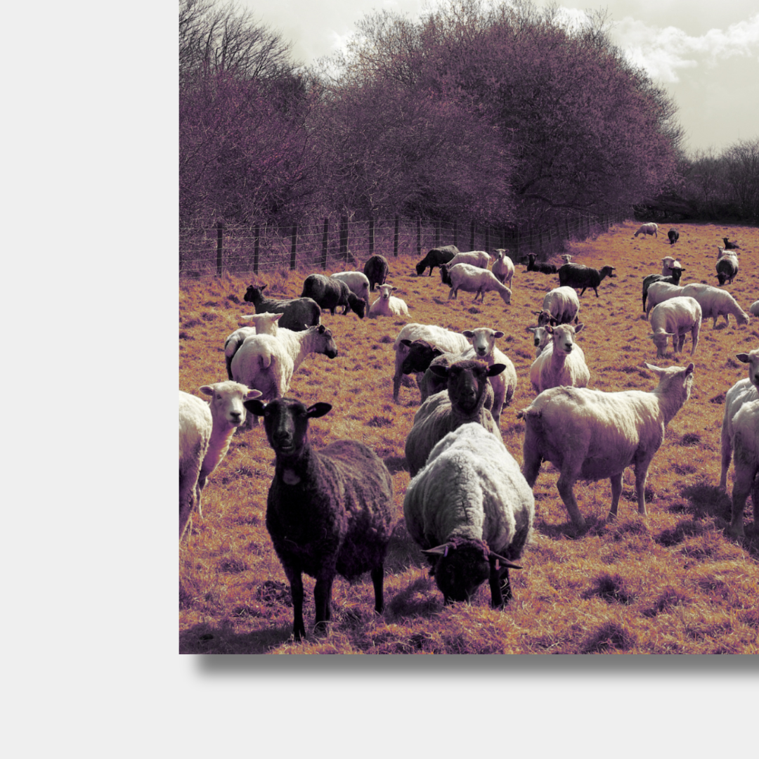 Photograph of a group of shorn sheep standing together at award winning regenerative farm, Fernhill Farm with a sepia overlay.